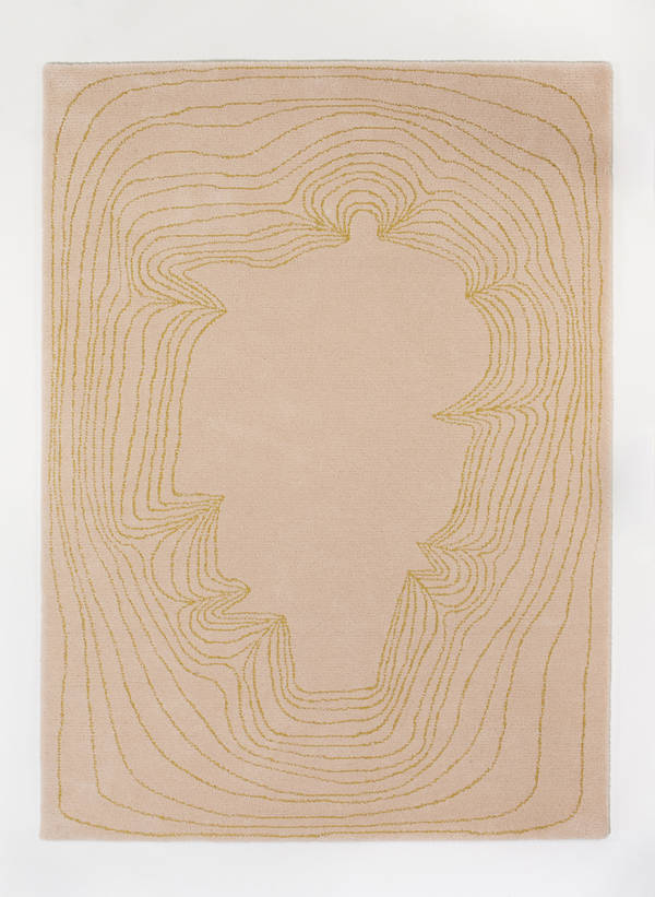 In the middle of the carpet lies a shape with a peculiar appearance. It is composed of a two-dimensional collage of different designs from the Wiener Werkstätte (Vienna's Workshop). These shapes do not appear to be self-explaining. Lines are drawn around the tufted inner surface. They also encircle the collage of shapes and merge it into the outward, a rectangle.